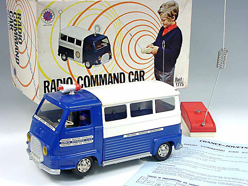 longueur 28 cm - moteur à pile & radio-commande (fonctionnent) mais mécanisme à revoir - en action, la camionnette avance - la télé-commande agit sur la direction du véhicule & sur la sirène placée sur le toit qui effectue un mouvement de rotation - manque le radar - notice & cales de boîte