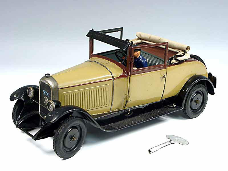 longueur 41 cm - moteur à clef (à revoir) - avec clef & phares électriques - échelle 1/10e - fabriquée de 1928 à 1932 - on y joint un conducteur en résine - avec petite plaque en tôle vraisemblablement agrafée à l'époque sur le radiateur par le magasin ayant vendu le jouet : 'PHOTO OPTIQUE J. GAMBS 4, R. PRESIDENT CARNOT LYON' - SUPERBE !