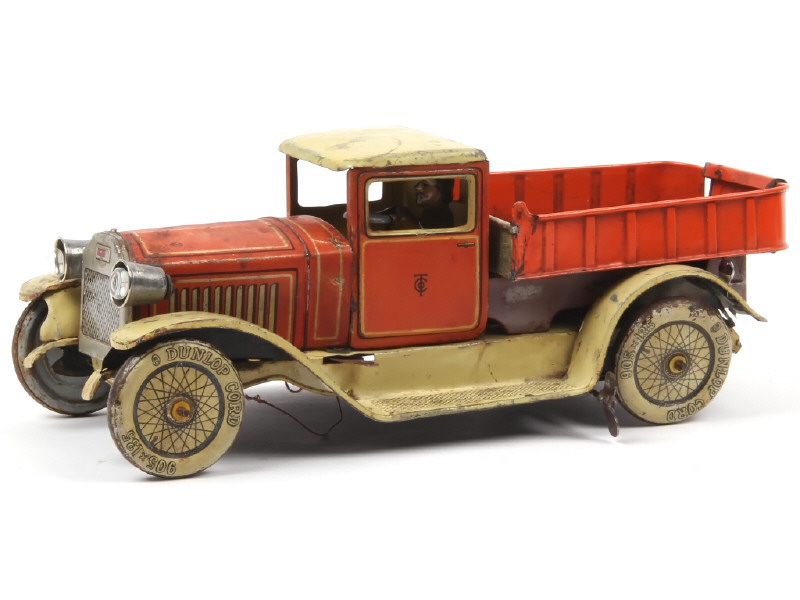longueur : 32 cm - avec moteur à ressort (à revoir) & direction - quelques éléments non d'origine (dont benne) - avec manques, parties cassées & oxydées