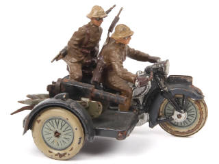 longueur 11,5 cm - version avec roues en métal & passager - quelques craquelures plus ou moins importantes par endroits - éclats plus ou moins importants par endroits (majeurs sur les roues) - traces d'oxydation avec quelques manques de matière - importantes traces d'oxydation sur la mitrailleuse (système à amorces fonctionne)