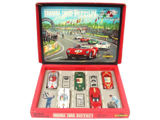 contient : 5 FERRARI (NÜRBURGRING, SILVERSTONE, MONZA, SEBRING & LE MANS), 2 moteurs & 6 roues de rechange - numéros de compétitions manquants sur un exemplaire - petit manque de papier & trace de ruban adhésif sur la boite