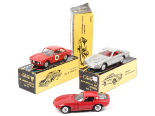 comprend : FERRARI 250 GT BERLINETTA (boite en état 'b'), ALFA ROMEO GIULIA SPRINT GT (plancher repeint & retouches avec élément & décalques ajoutés - oxydation sur le coffre qui en état 'C') - on y joint une ALFA ROMEO GIULIA CANGURO de la marque MERCURY avec une boite POLITOYS (traces de colle sous la vitre arrière - état 'B')