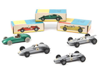 comprend : BRABHAM, PORSCHE (FII) & COOPER 1500 - petites étiquettes collées sur les boites - on y joint une PORSCHE F1 de la marque INGAP sans boite en état 'B' (frottements sur le plancher, encrassé)