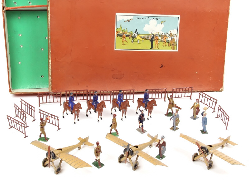 réalisation en plomb creux & tôle - états de 'B' à 'D' - dimensions du coffret : 48,5 x 31 cm - contient : 3 monoplans, 13 figurines, 13 barrières & un accessoire - avec supports de présentation (manque ficelles) - manques majeurs de peinture sur les avions - quelques petits manques & retouches par endroits - coffret taché & endommagé