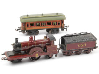 écartement 'O' - retouches avec petits éléments manquants & légères déformations par endroits - le tender est en état 'C' - on y joint une voiture de voyageurs de la marque BING en état 'C' avec manques - quelques traces d'oxydation