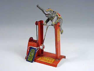 hauteur 23 cm - mécanisme à clef (fonctionne poussivement) - en action, l'animal fait des acrobaties - éléphant refixé - une pliure sur le support - on y joint un panonceau