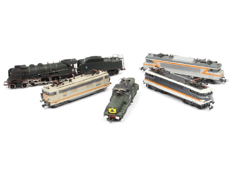 non testé - comprend : locomotive type 231 avec tender, motrice BB 13001, 16703 & 22230 - on y retrouve notamment la marque JOUEF - carrosseries plus ou moins encrassées - possibilité de petits manques, parties cassées & traces d'oxydation