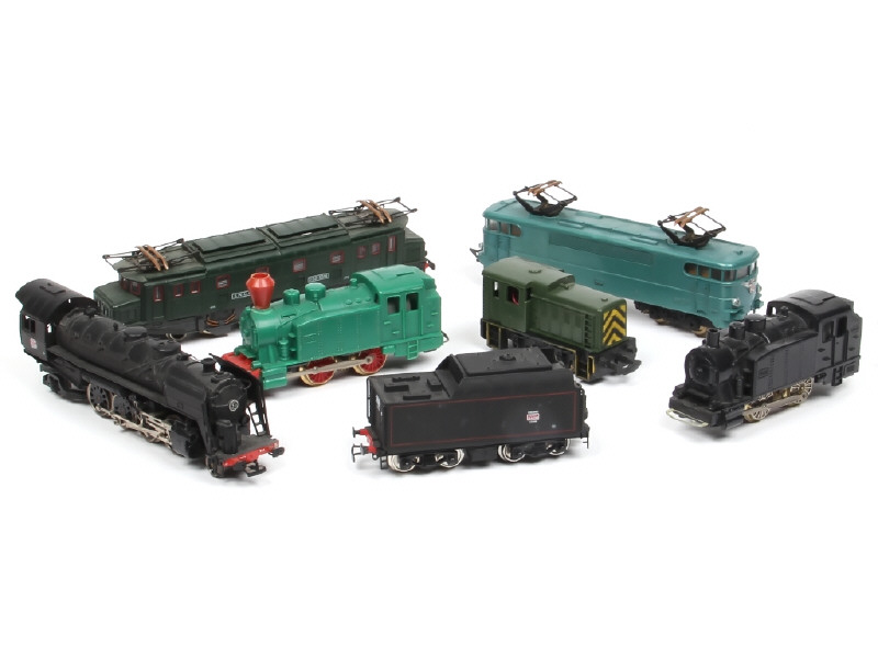 non testé - comprend : motrices électriques, DIESEL & locomitives à vapeur (dont une avec tender) - possibilités de petits éléments cassés & manquants - légères traces d'oxydation - carrosseries plus ou moins encrassées