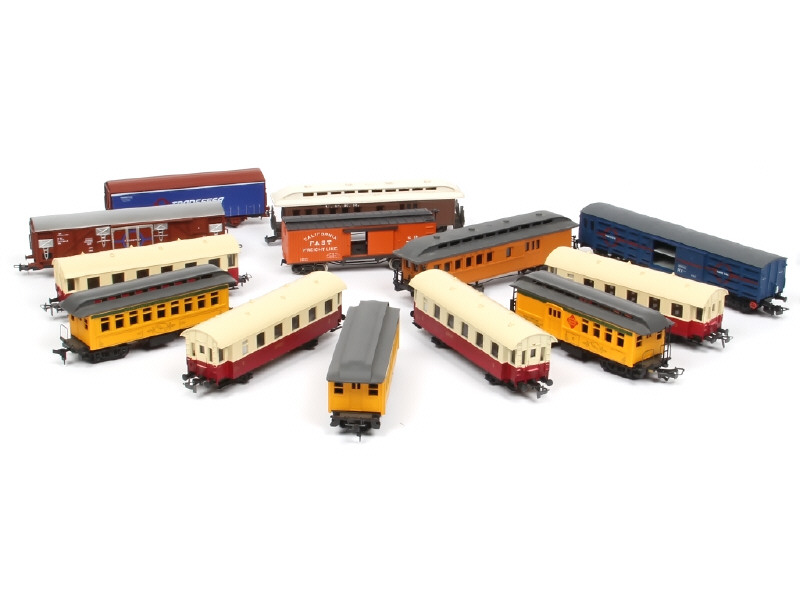 comprend : wagons de marchandises & voitures-voyageurs - on y retrouve notamment les marques : ELECTROLEN & POCHER - possibilités de petits manques, parties cassées & traces d'oxydation