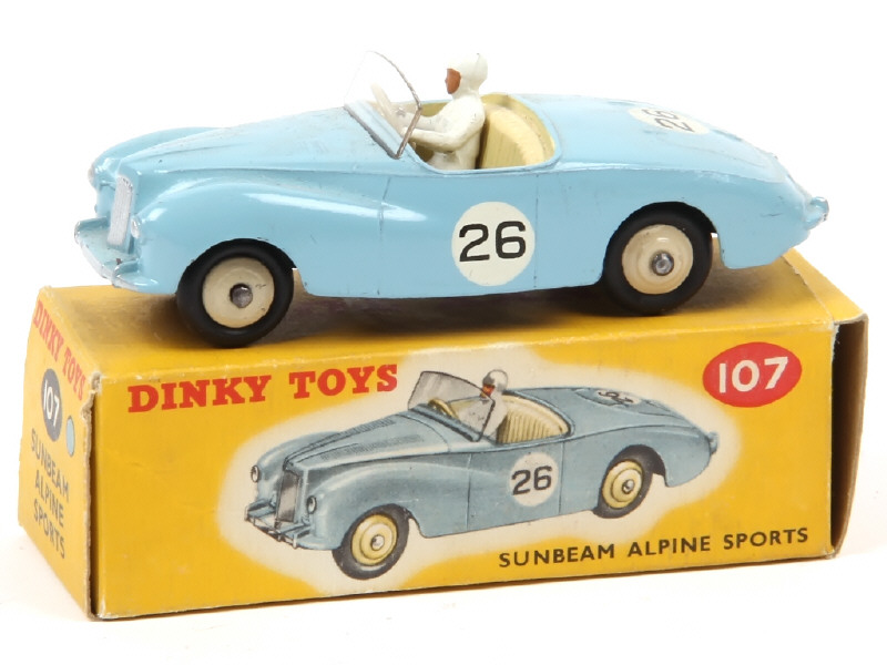 DINKY TOYS (GB) 107 SUNBEAM ALPINE de course bleu ciel, intérieur crème