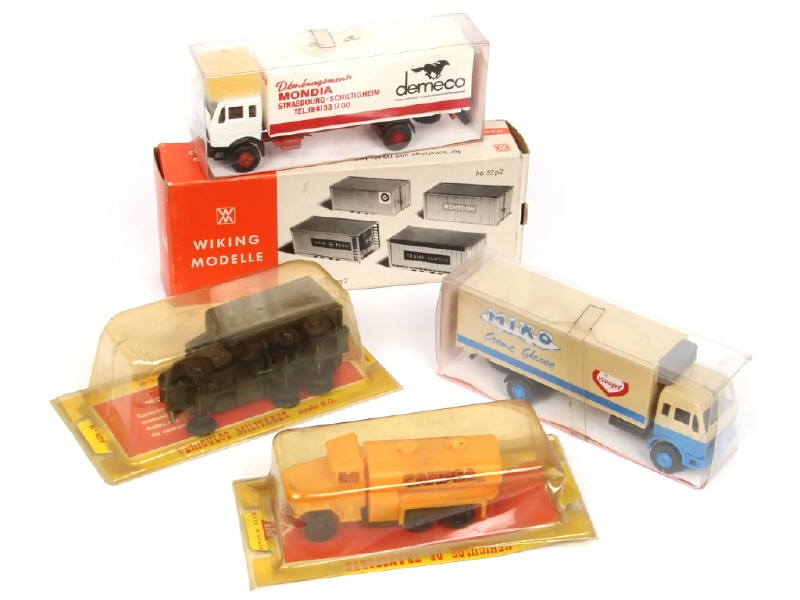 comprend : MERCEDES 'DEMECO', 'MIKO', camion citerne 'CAMPSA' & militaire bâché (trace de colle sur le plancher & de peinture sur le toit - on y retrouve les marques EKO & ROSKOPF - on y joint 4 containers de la marque WIKING (autocollants à recoller en partie)