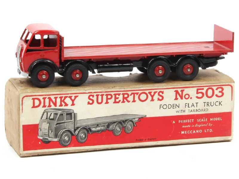 DINKY TOYS (GB) 503 FODEN Plateau à dosseret rouge, châssis & filets noirs