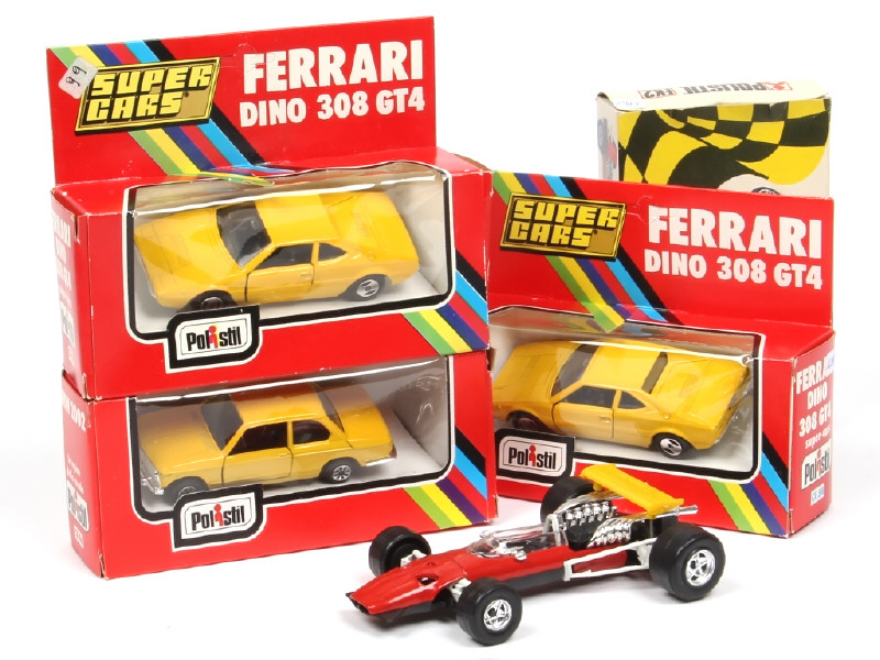 comprend : FERRARI F1 (échelle 1/32ème), DINO 308 GT4 (2 exemplaires) & BMW 2002 (en état 'A-') - une boite avec petits accrocs