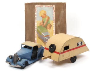 longueur de l'ensemble : 68 cm - contient : une RENAULT VIVA SPORT cabriolet capoté (avec moteur à clef fonctionne, direction & phares électriques non testés, très légères restaurations) & une caravane (2 charnières de portes restaurées, frottements plus ou moins importants avec très légers enfoncements par endroits) - pneus séchés & plus ou moins craquelés (dont 2 légèrement affaissés) - légères retouches par endroits - manque un plastique de phare - pare-chocs frottés - fond de boîte non d'origine - quelques traces d'oxydation