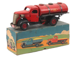 longueur 37 cm - avec moteur à clef (fonctionne) & direction - sans conducteur - quelques éléments non d'origine (dont train avant & volant) - manque quelques fixations & petits éléments - cabine en partie désolidarisé - parties plus ou moins ternies avec traces d'oxydation - boîte tachée