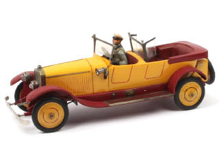 longueur : 52 cm - fabrication de 1927 à 1943 - avec moteur à clef (fonctionne), direction par le volant, phares électriques (non testés) & chauffeur - quelques accessoires manquants - TRES BELLE RESTAURATION !