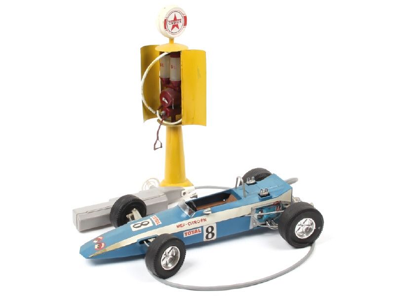 longueur : 40 cm - moteur à piles (à revoir) - manque pilote - carrosserie légèrement encrassée - on y joint une pompe à essence 'CALTEX' (en état 'R') de marque indéterminée