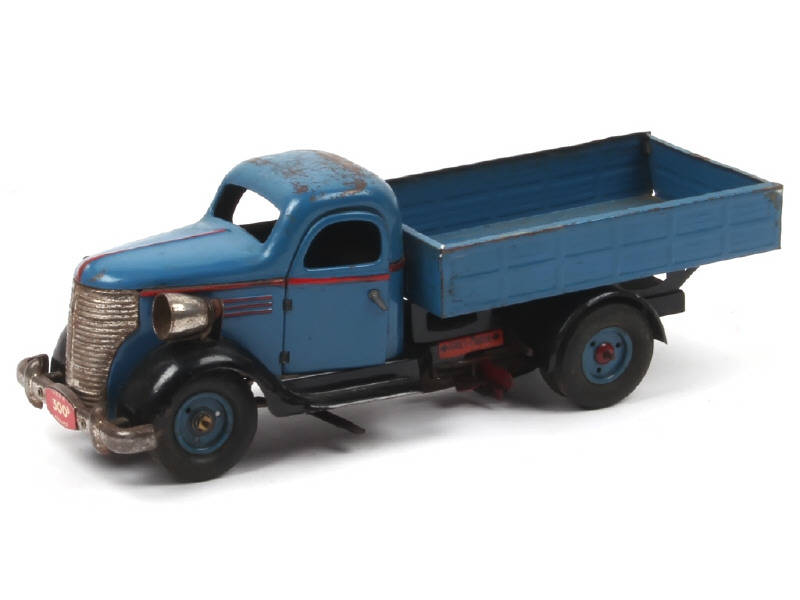longueur 35 cm - avec moteur à clef (fonctionne poussivement), direction & phares électriques (non testés, manque ampoules) - quelques petites retouches & agrafes cassées par endroits - traces d'oxydation - quelques manques (dont volant) & petits éléments non d'origine