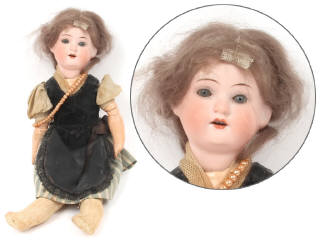 taille : 27 cm environ - tête en biscuit (sans fêle apparent) - marquage 'ARMAND MARSEILLE GERMANY 390 ' - yeux bleus en sulfure dormeurs - corps en composition (quelques éclats) - perruque en mohair (manque de cheveux), calotte & vêtements anciens