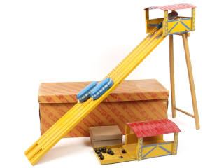 2ème version de 1956 - dimensions : 90 x 40 cm - mouvement à billes faisant monter & descendre simultanément les 2 cabines - avec 12 billes & bon de contrôle - boîte légèrement décolorée (proche de l'état 'b')