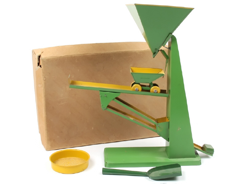 dimensions du coffret : 36 x 27 cm - contient : une trémie, tamis, wagonnet & pelle à sable - quelques petits frottements par endroits - boîte décolorée