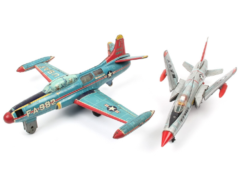 envergure : 46 cm - avec moteur à friction (fonctionne) & réacteur lumineux (système de pierre à briquet à revoir) - traces d'oxydation sur l'ensemble de l'appareil (dont certaines majeures) - manque 2 éléments de nez - un pneu légèrement affaissé - on y joint un avion de chasse américain (état 'C') de la marque YONEZAWA (moteur à piles à revoir, manque trappe du compartiment)