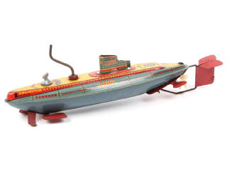 modèle proche de l'état 'B' - longueur : 27 cm - moteur à inertie (fonctionne) - manque bouchon de ballast & tube de canon - petites traces d'oxydation avec très légères déformations par endroits