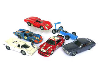 comprend SOLIDO ALFA ROMEO 33/3 (manque aileron AR), PORSCHE 934 Turbo Le Mans (décoration compléte posée avec légers manques), PORSCHE 918 Le Mans 1971, ALPINE RENAULT 3l Le Mans 1968 (décoration compléte posée, manque lunette AR), VEREM ALFA ROMEO 2600 (une porte condamnée) & MATRA V8 F1 (manque échappement, aileron recollé, avec boite)