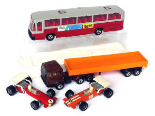 comprend LOTUS 3l F1, Mac LAREN 3l F1, MERCEDES avec semi plateau à ridelles & DAF autocar "UTRECHT" (avec boite)