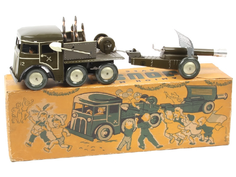 JOUSTRA (FRANCE) 701 Camion militaire tire-canon en tôle lithographiée kaki
