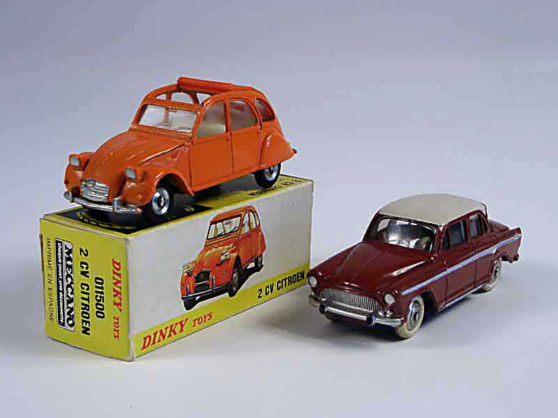 DINKY TOYS (FRANCE) 500 CITROËN 2CV Décapotée (made in SPAIN) orange avec plancher riveté & plaque minéralogique arrière jaune