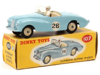 DINKY TOYS (GB) 107 SUNBEAM ALPINE de course bleu ciel, intérieur crème