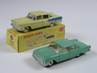 DINKY TOYS (GB) 179 STUDEBAKER PRESIDENT Sedan jaune citron & filets bleus, jantes aluminium