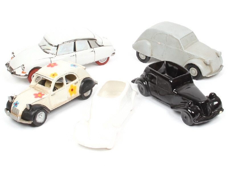 comprend : TRACTION (2 exemplaires - cendriers en porcelaine), 2CV (2 exemplaires en résine & pierre) & DS (en porcelaine de la marque PRISE COLLECTION)