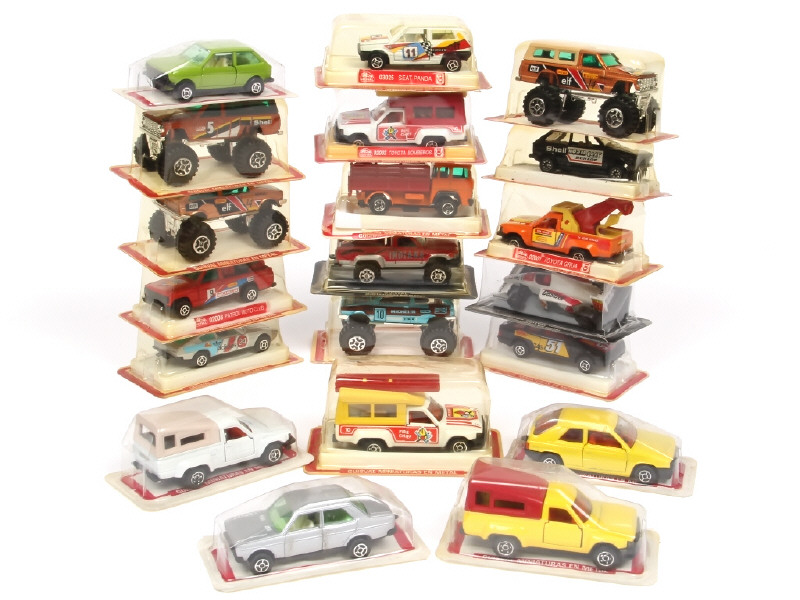 petite échelle - miniatures reproduisant notamment les modèles : MAGIRUS, MATRA SIMCA, TOYOTA & FORD - sous blister jamais ouverts (certains en état 'c' & plus ou moins jaunis)