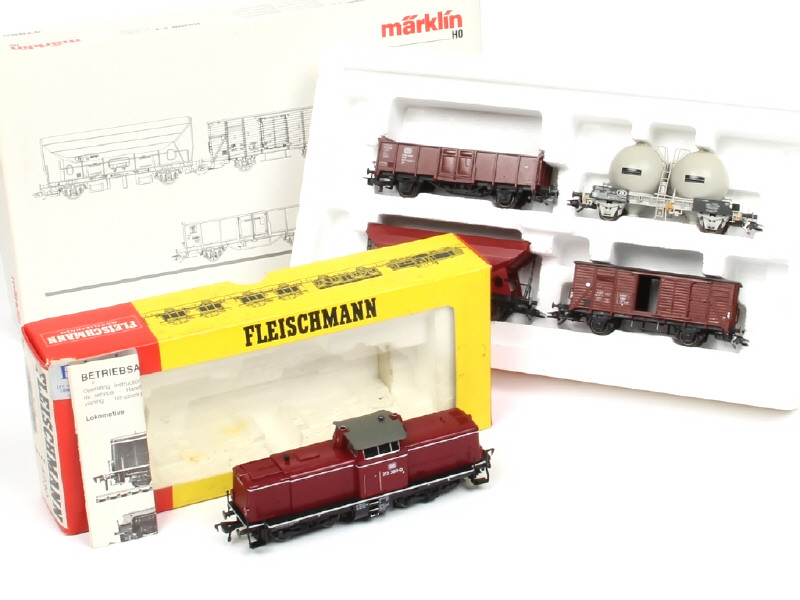 non testé - comprend : motrice Diesel 212 380-0 'DB' (traces d'humidité sur la boite) & 4 wagons marchandises (regroupés dans un même coffret référence 47888) - on y retrouve les marques : FLEISCHMANN & MÄRKLIN