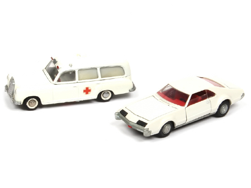 comprend : MERCEDES 220S ambulance (avec fanion) & OLDSMOBILE TORONADO - carrosseries plus ou moins encrassées