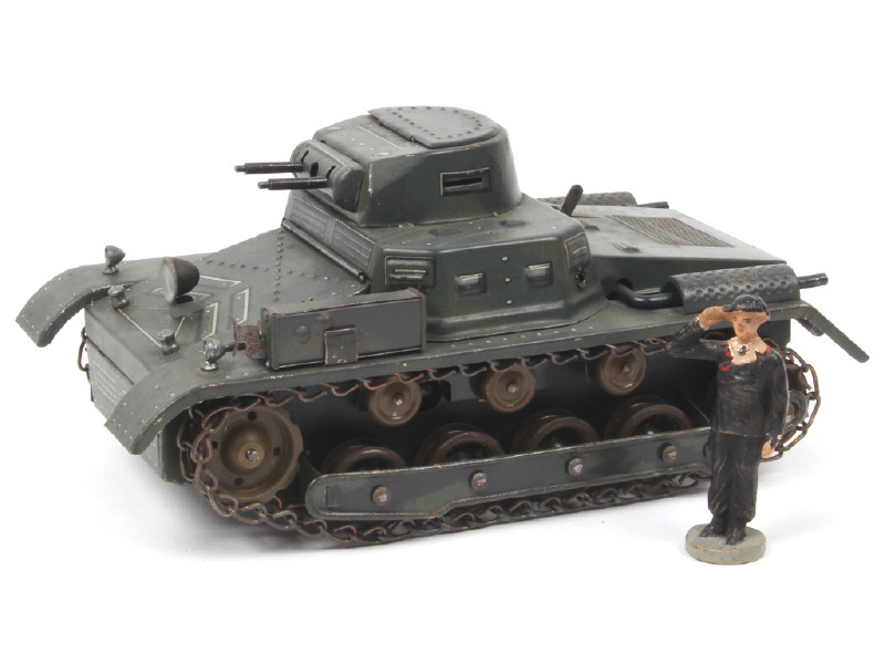 longueur 23 cm - avec moteur à clef (fonctionne) & système à amorce - quelques petites traces d'oxydation par endroits - on y joint un chef de char en composition