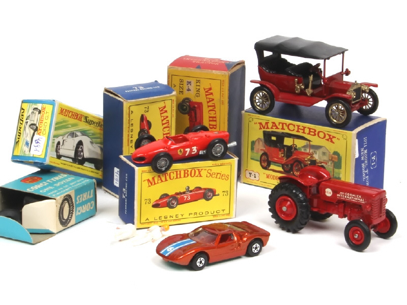 comprend : FORD GT, MODEL T, INTERNATIONAL TRACTOR & FERRARI RACING CAR (2 exemplaires dont un sans pilote) - on y joint une boite de 13 pneus de la marque CORGI (non conformes) & 2 pilotes en plastique