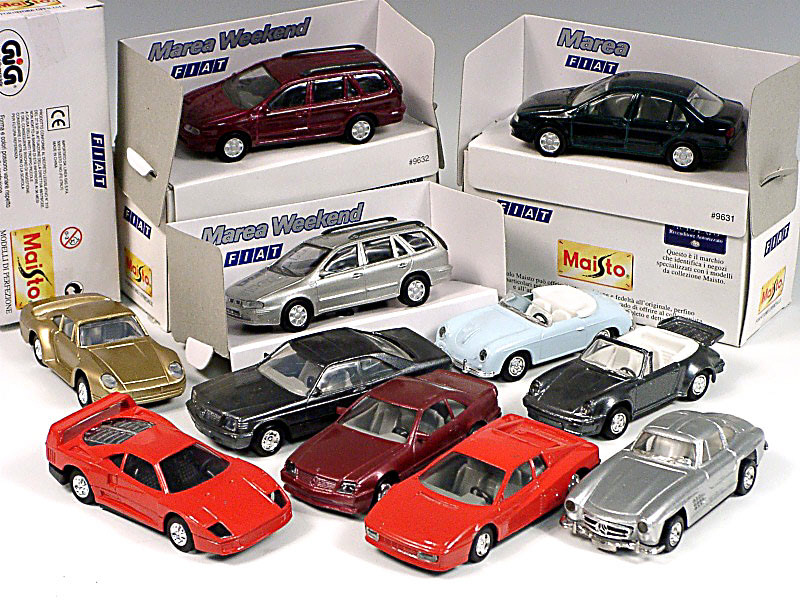 miniatures reproduisant les marques : FERRARI, FIAT, MERCEDES & POSCHE - on y retrouve les marques MAISTO & DELES - 3 modèles avec boîte