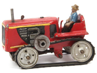 moteur à clef (fonctionne) - avec conducteur (repeint) - quelques retouches & éclats majeurs - traces d'oxydation sur le moteur & les vis de châssis - chenilles encrassées