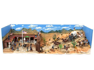 dimensions : 100 x 35 x 29 - comprend : cavalerie américaines, indiens, fort & differents accessoires (quelques déformations) & dioramas réalistes (rochers, végétation & paysage) - réalisation artisanale sur base DELPRADO & BLUEBOX - ATTENTION PAS D'EXPEDTION POUR CE LOT
