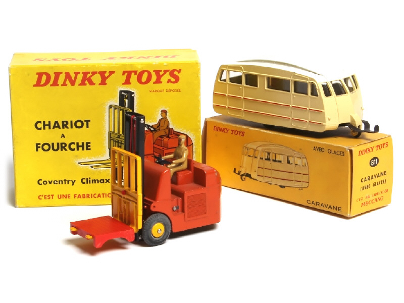 comprend : chariot à fourche (quelques micro-éclats par endroits - manque câle de boite) & caravane (version avec glaces)