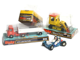 états de 'A' à 'B' - comprend : véhicule lunaire, SHOVEL DOZER & AEC semi-remorque plateau 'TRUCK HIRE CO LIVERPOOL' - 2 boites plus ou moins déformées & salies