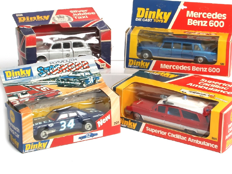 comprend : MERCEDES 600 (cale de boite déchirée), CADILLAC SUPERIOR ambulance, PLYMOUTH stock car (boite avec accrocs) & AUSTIN taxi (boite en état 'c')