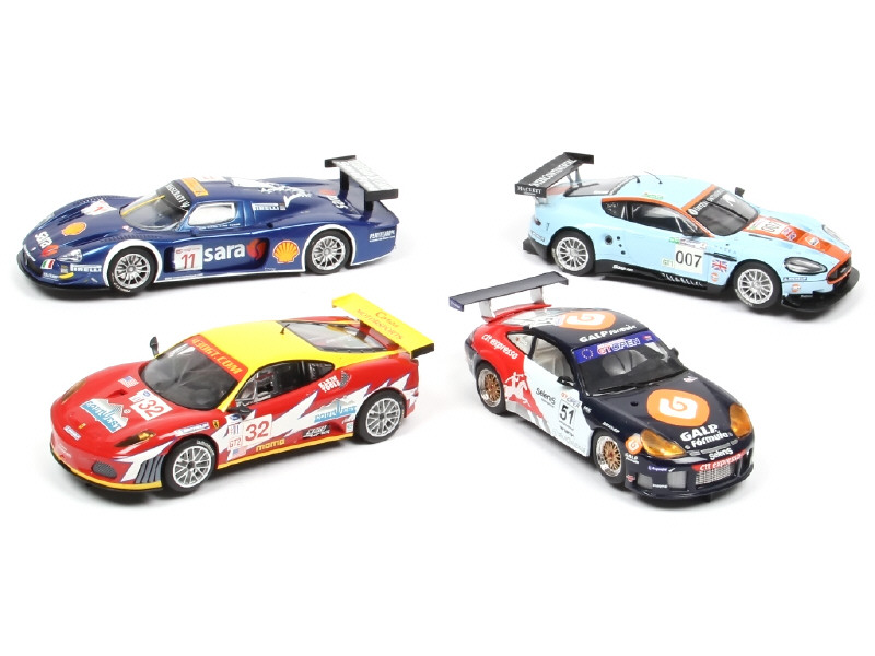 pour circuit - fonctionne - comprend : FERRARI F430 GT, PORSCHE 911 GT3R, ASTON MARTIN DB R9 & MASERATI MC 12 (manque un rétroviseur) - antennes plus ou moins déformées