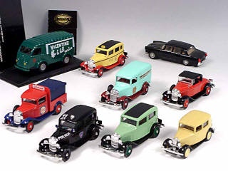 miniatures reproduisant les marques : FORD, RENAULT, PEUGEOT & LANCIA - un modèle avec boîte & un personnage
