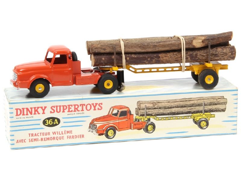 DINKY TOYS (FRANCE) 36A WILLEME Fardier (version avec jantes convexes & remorque ajourée) orange & jaune
