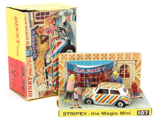 DINKY TOYS (GB) 107 MINI MINOR 'STRIPEY THE MAGIC MINI' blanc à chevrons bleus, jaunes & rouges
