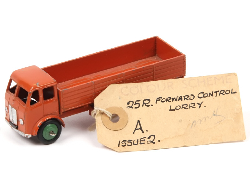 il s'agit d'un essai couleur (retenu ensuite pour la diffusion en série) sur un moule dont le plancher est encore totalement vierge de toute gravure - une étiquette carton tamponnée 'COLOUR SCHEME' mentionne la future référence du modèle (25R), le numéro d'essai (A issue 2) ainsi que la nomenclature des peintures utilisées - cet ensemble provenant de l'usine MECCANO de LIVERPOOL faisait partie de la collection de Jean-Michel ROULET - une attestation du vendeur sera remis à l'heureux adjudicataire de cette pièce unique !